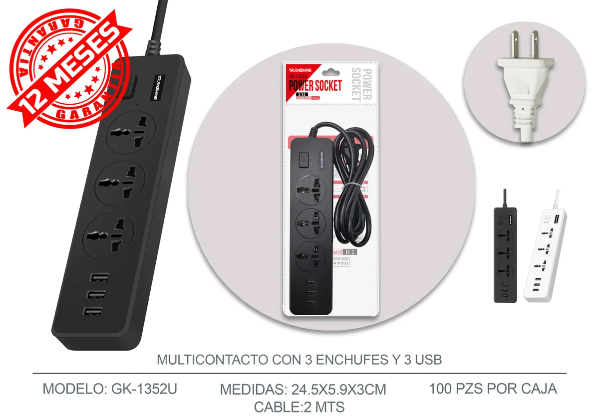 Barra Multicontacto 3 Enchufes, 3 Puertos USB – TRANSHINE